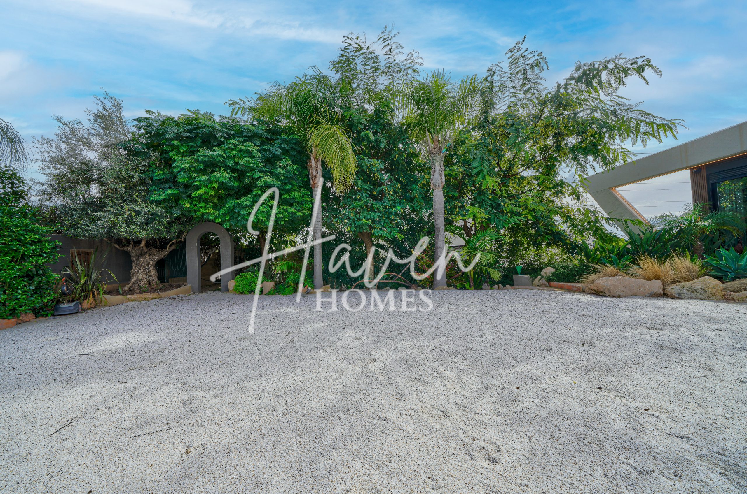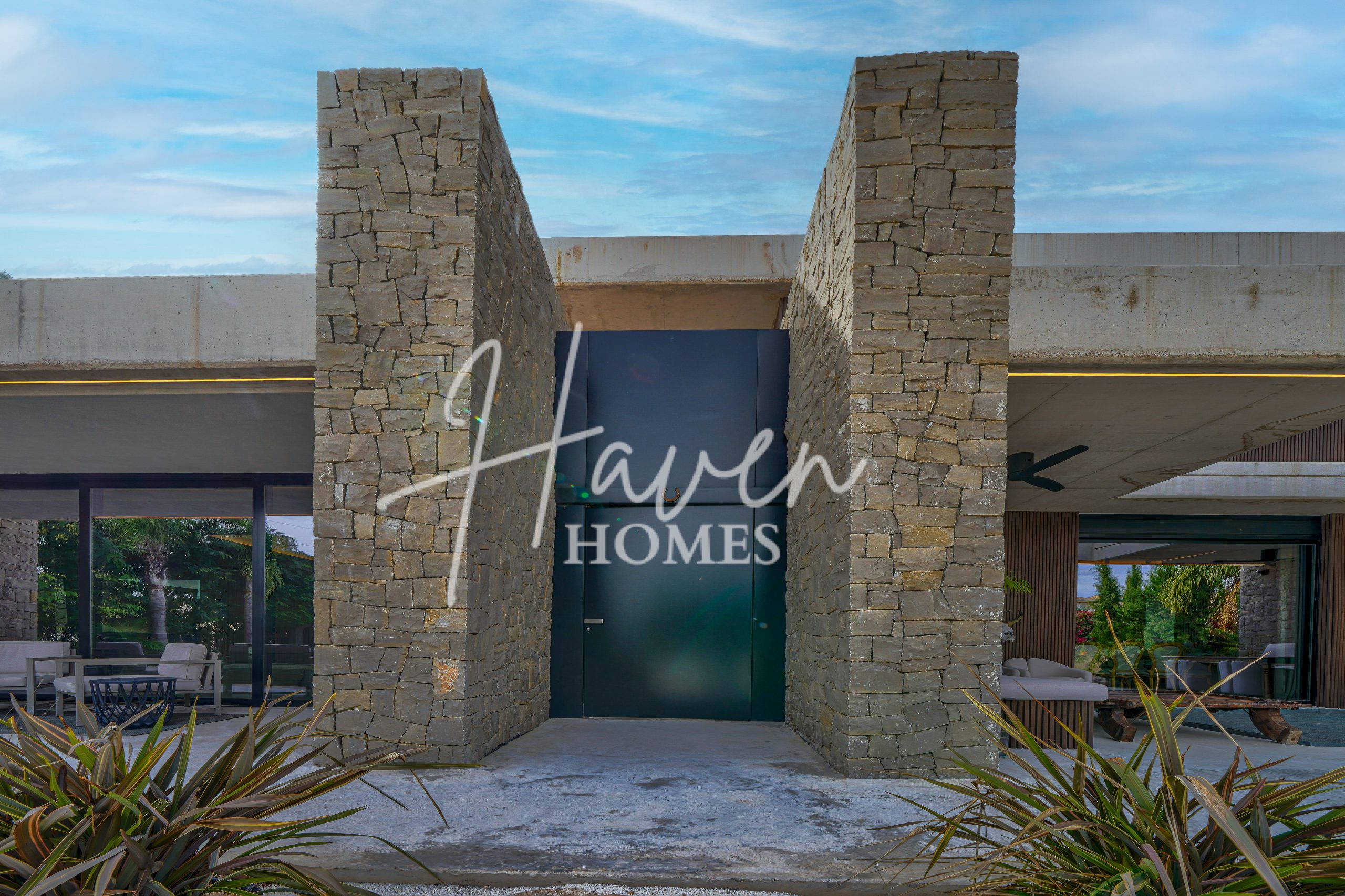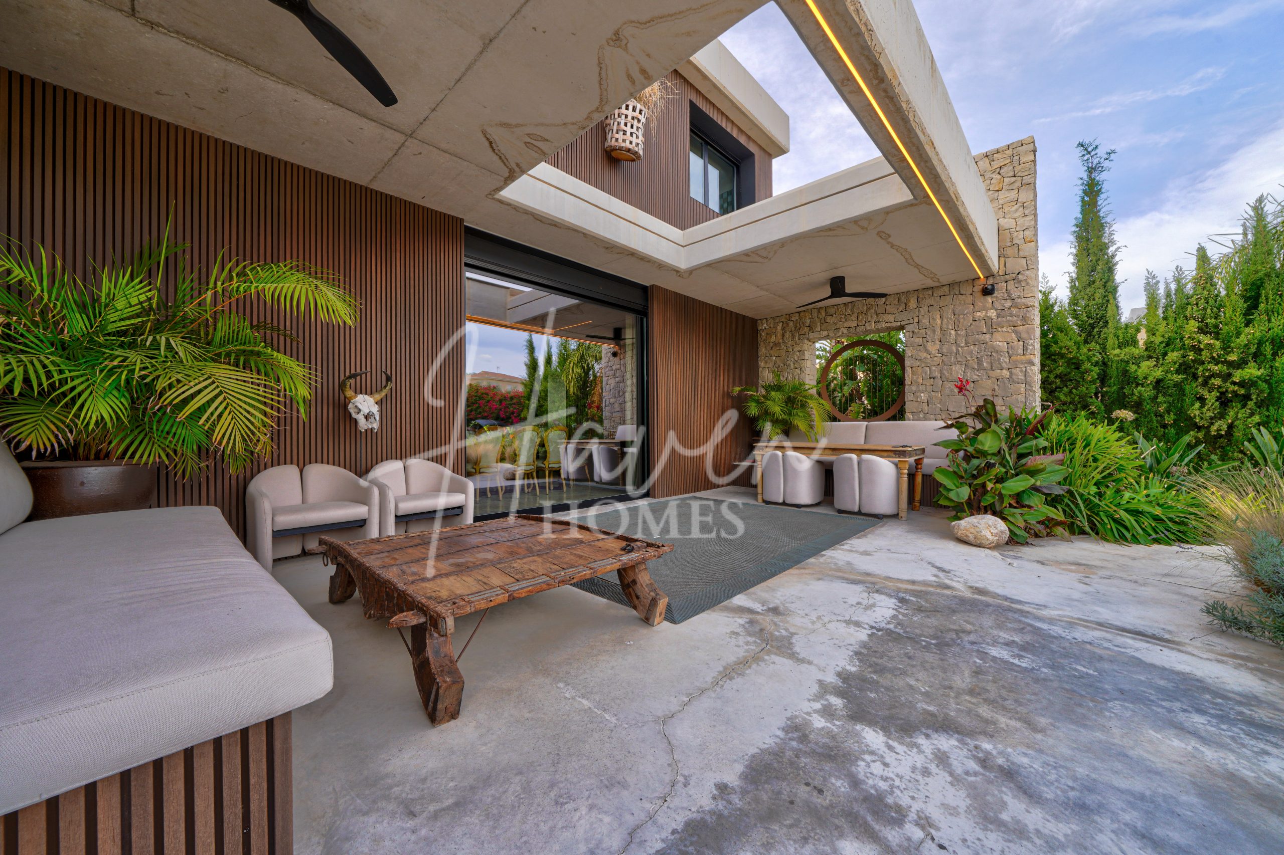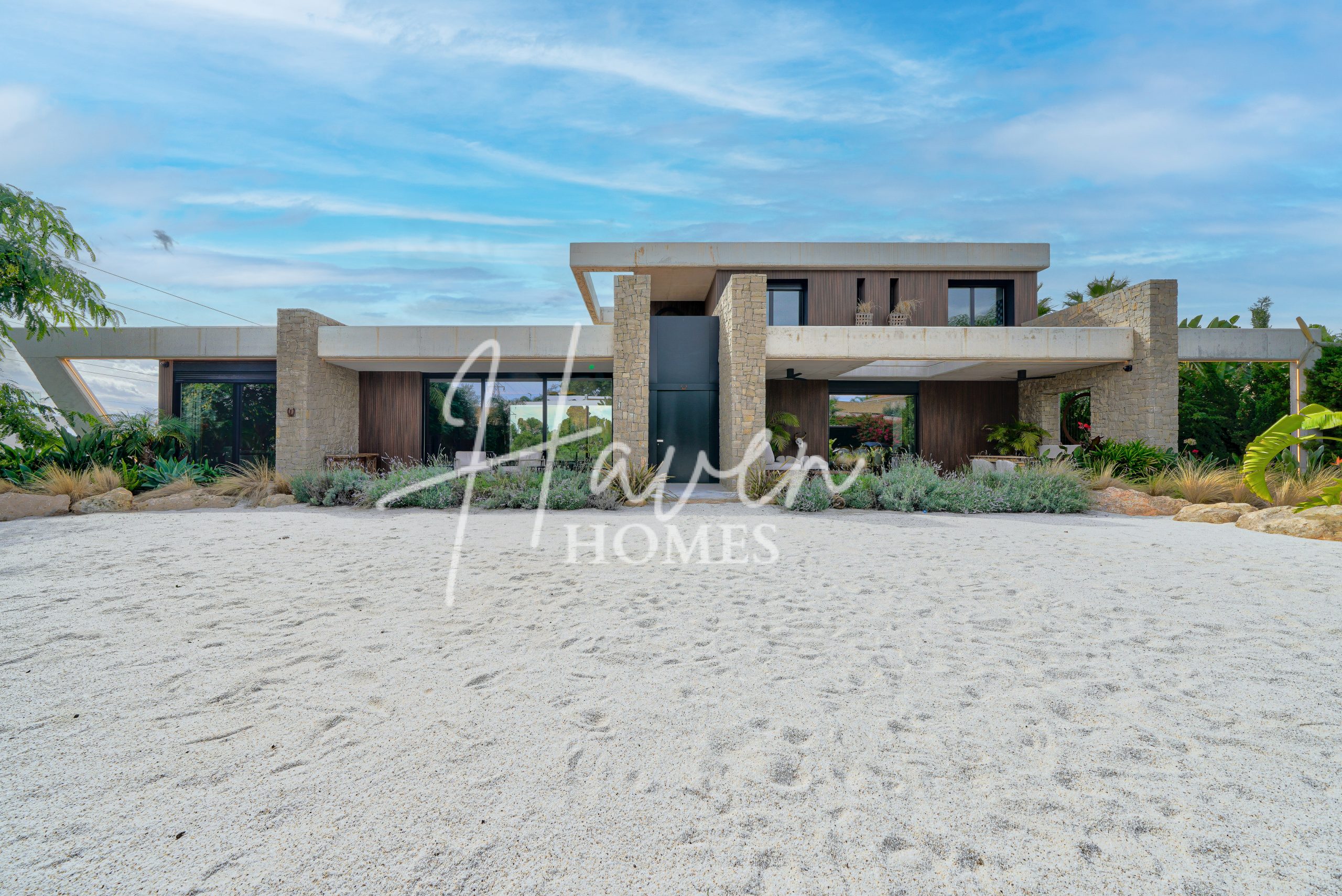 Al traspasar la puerta de entrada que nos comunica desde el exterior, nos impacta encontrarnos con un diseño paisajístico tropical minimalista tipo gran playa privada con arenas blancas, y plantas con armónico aire “desenfadado” y con enfoque en preservar la privacidad y a la vez cede protagonismo a la gran fachada de la Villa que replica una gran embarcación encallada y apacible, con dos amplias terrazas exteriores laterales, con vistas a este monumental oasis de paz.