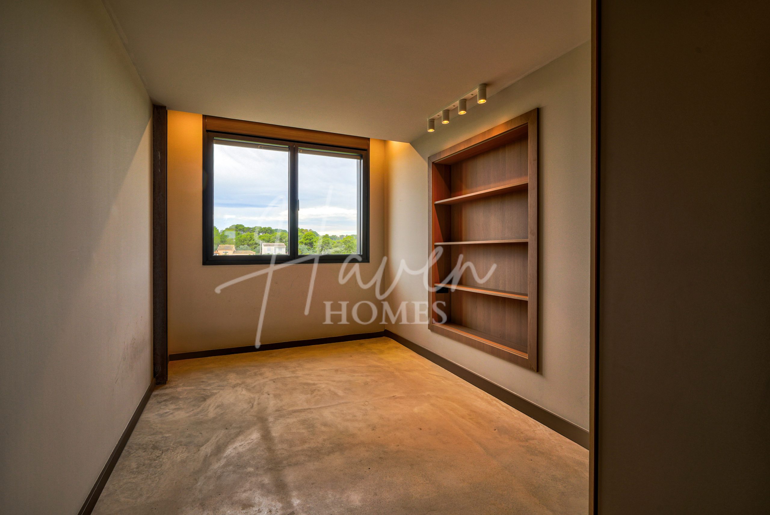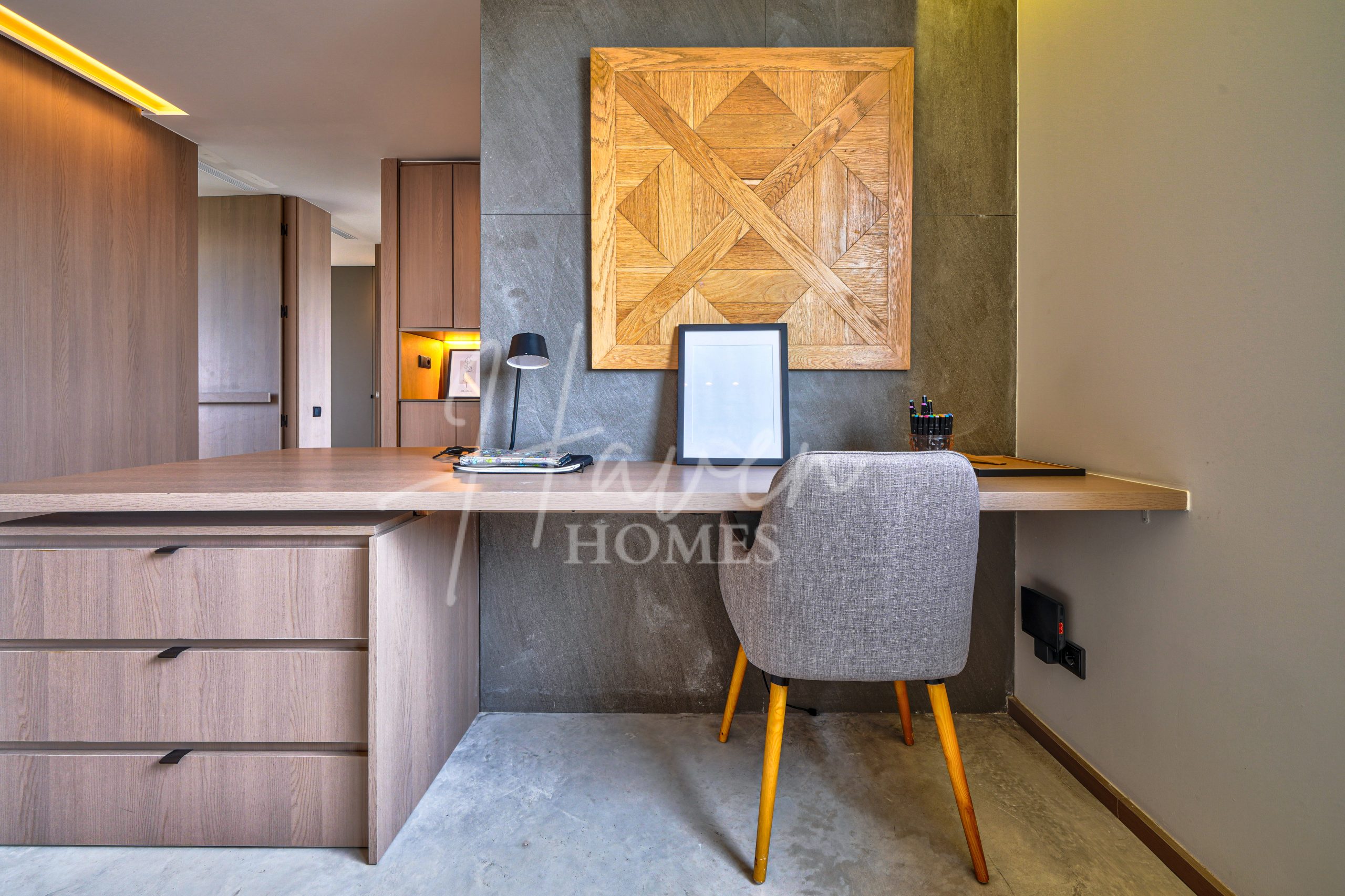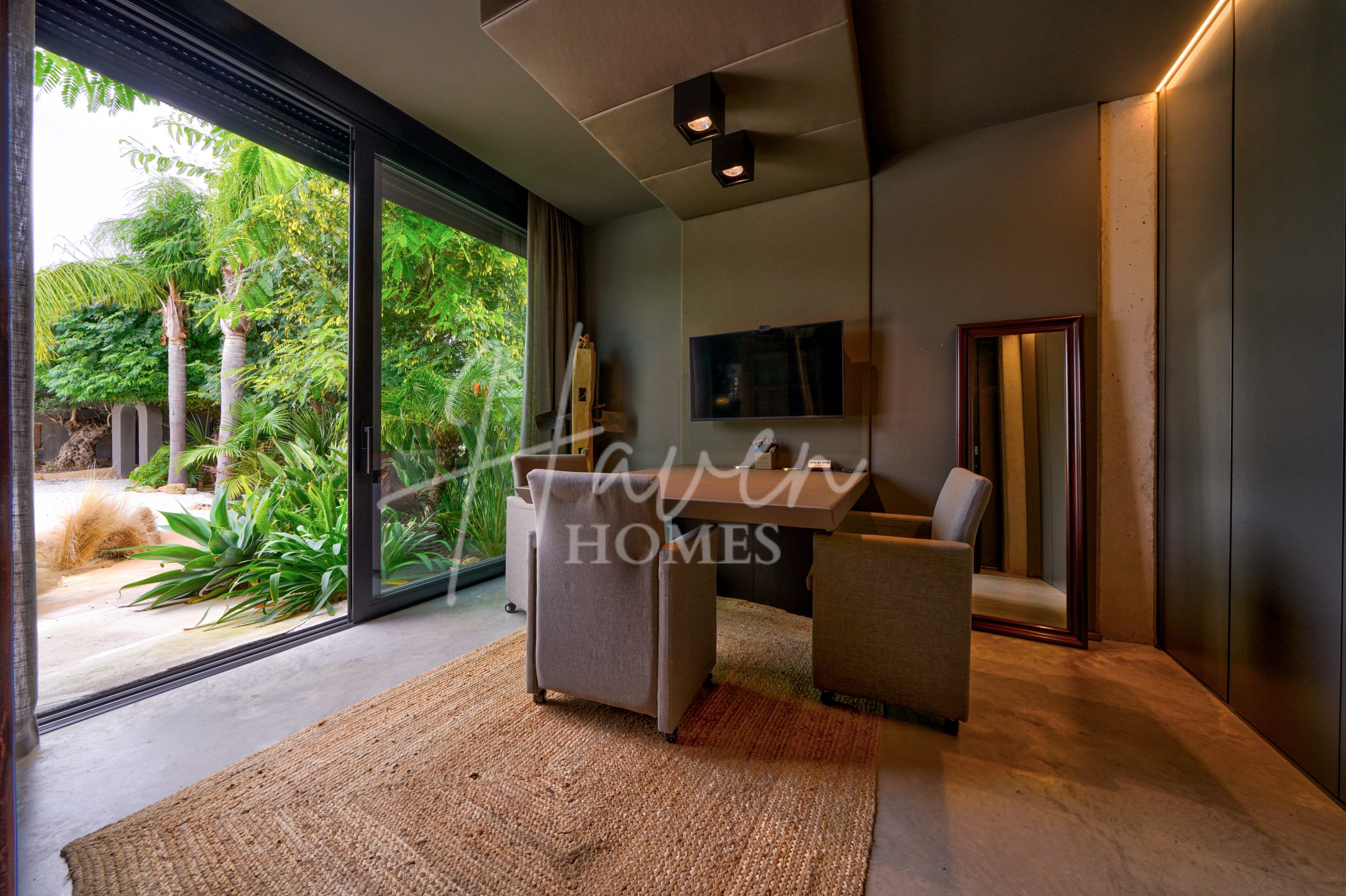 En esta ala de la propiedad, hallamos también el dormitorio principal decorado en tonos cálidos, con vistas a la piscina, con baño privado y vestidor, así como el despacho con vistas a la playa privada. Las puertas de acceso a este dormitorio y y al despacho son tipo ocultas y se mimetizan con el ambiente del salón.