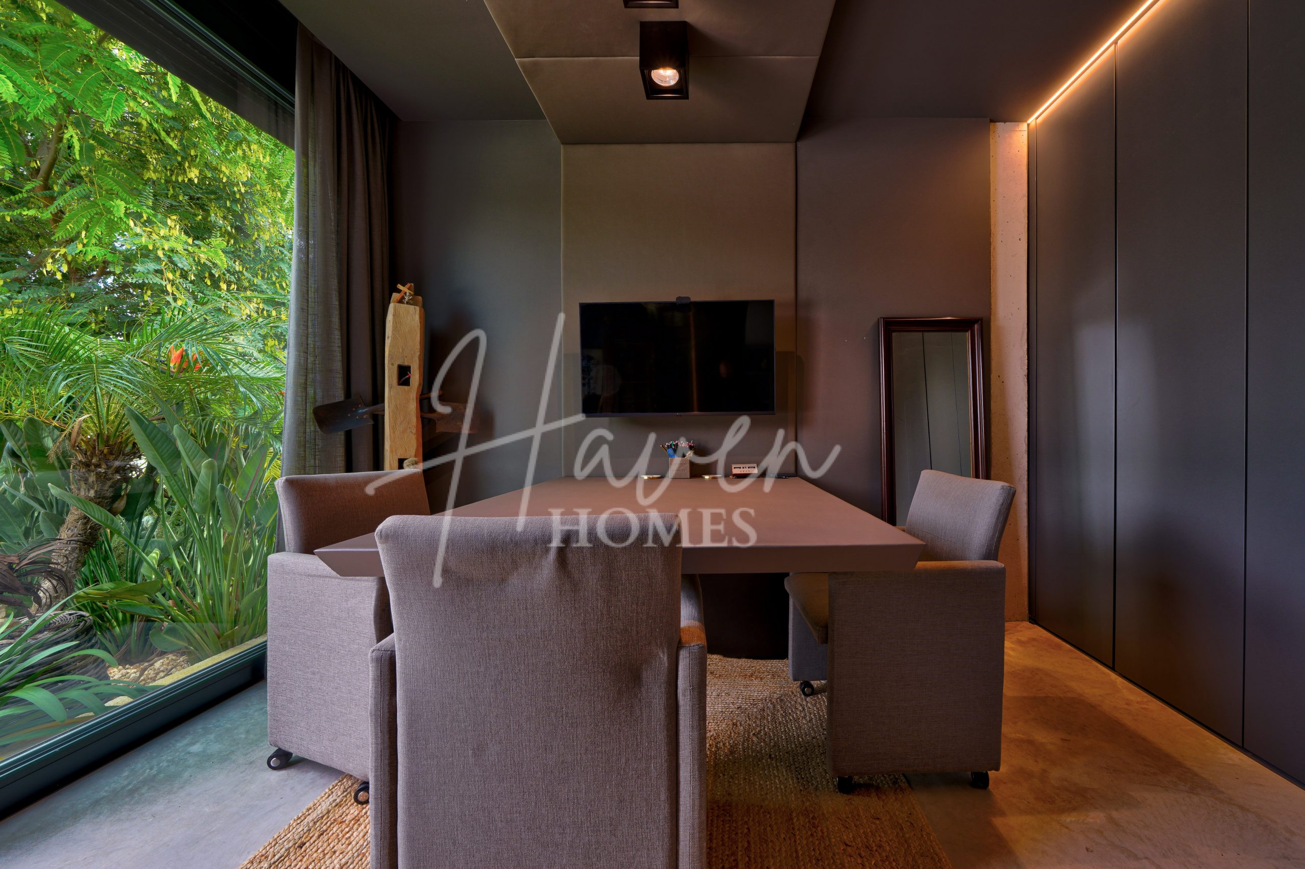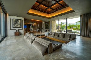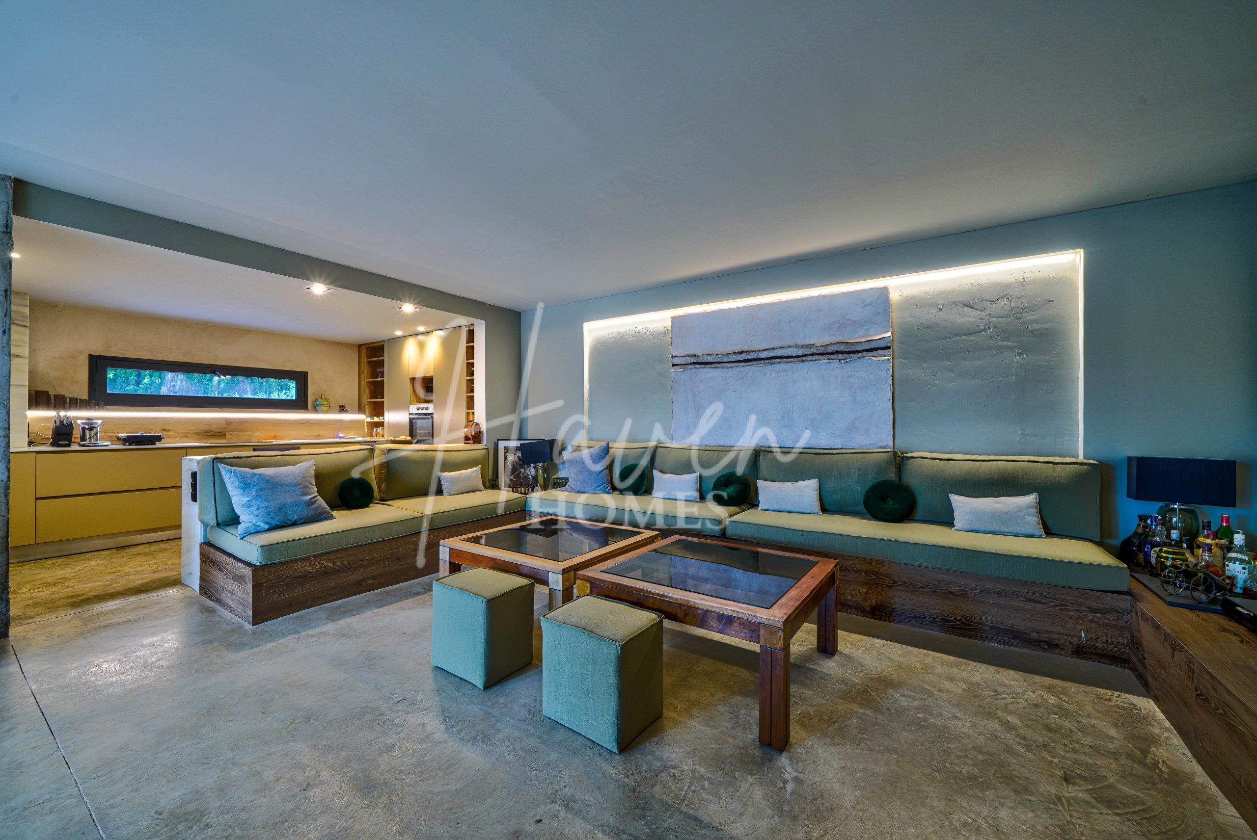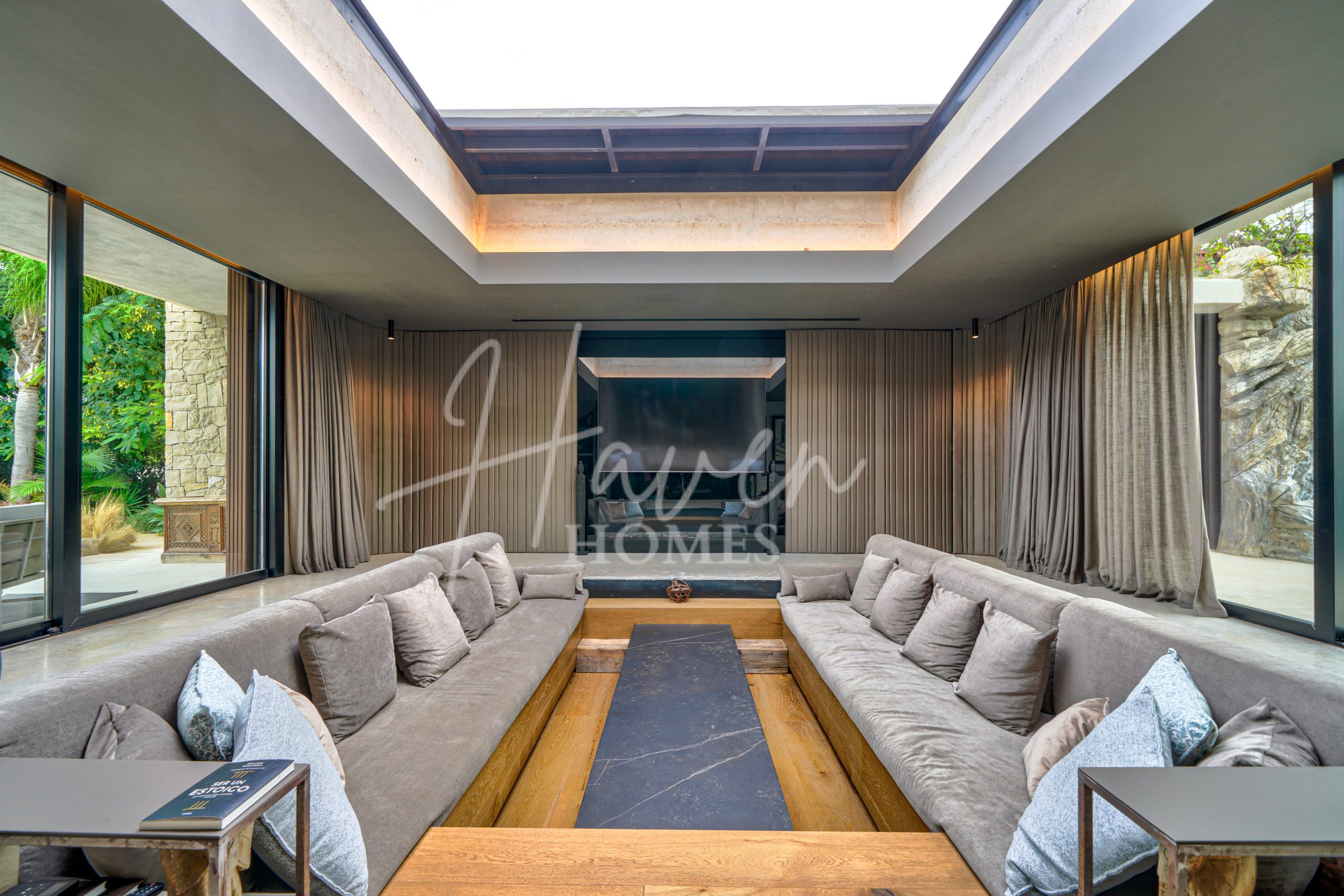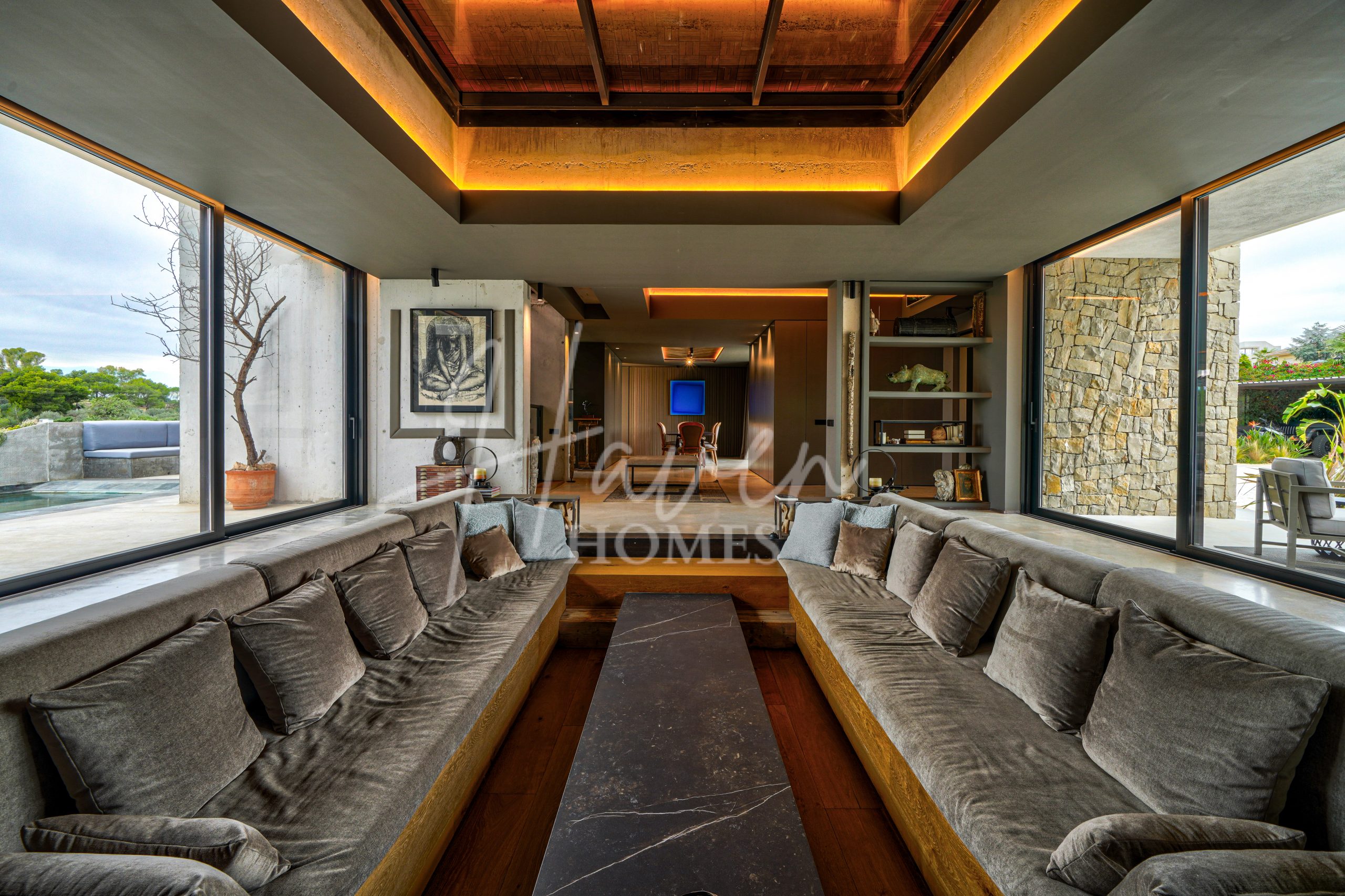 Nos enamora especialmente, su diáfano salón en desnivel ubicado en el ala izquierda de esta planta, con sofás a medida, mesón – suelo pasarela radiante, pantalla plana tipo cine, chimenea a gas y su impresionante techo retractable – lucernario de diseño silencioso y arquitectónico, que invita a disfrutar de inolvidables noches a la luz de las estrellas, desde el calor del hogar. Este salón tiene paredes en piel acolchada en forma curva con increíble sistema de insonorización, y vistas a la playa privada y a su piscina salina tipo Infiniti, con cascada e iluminación crepuscular.