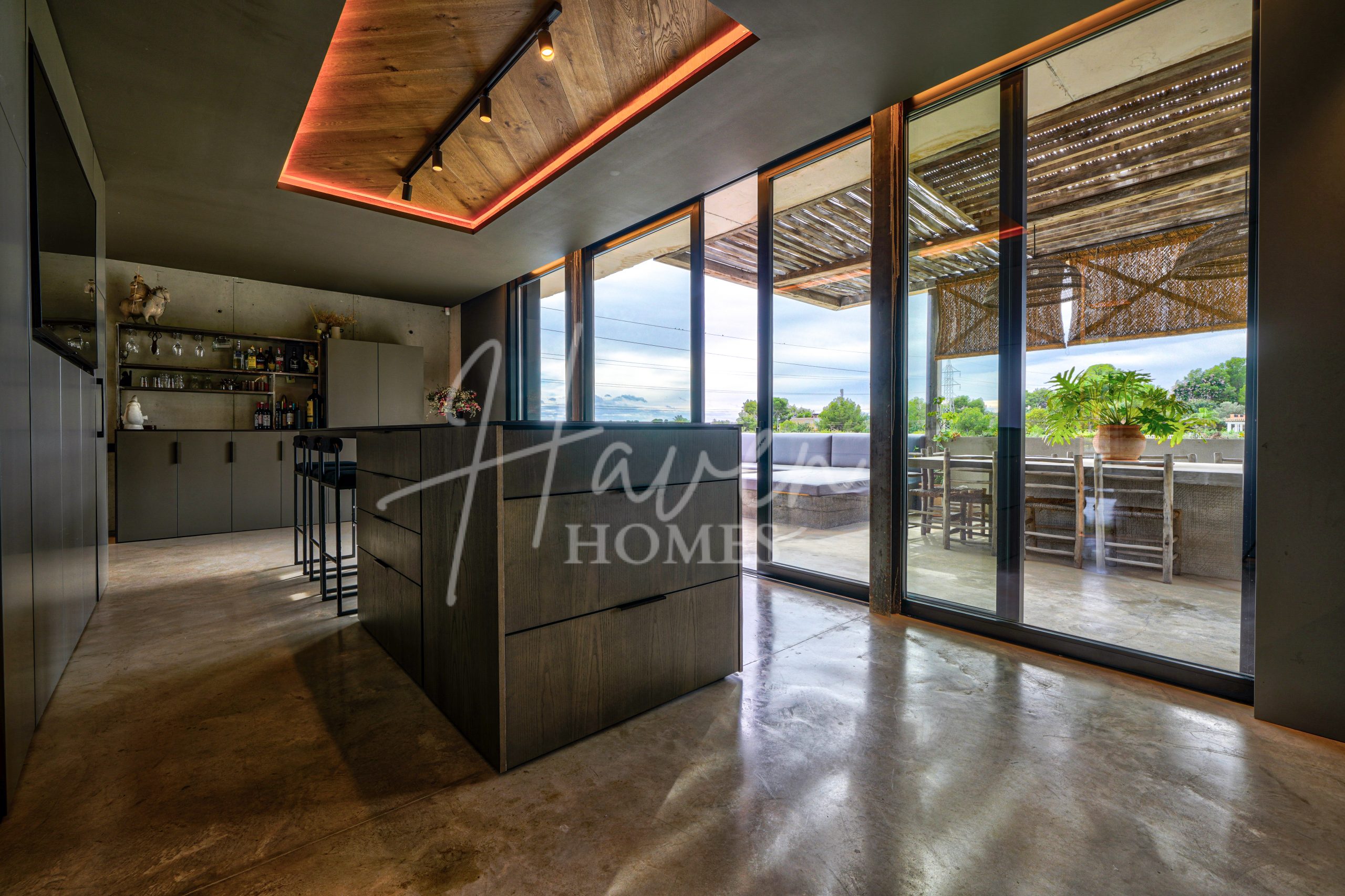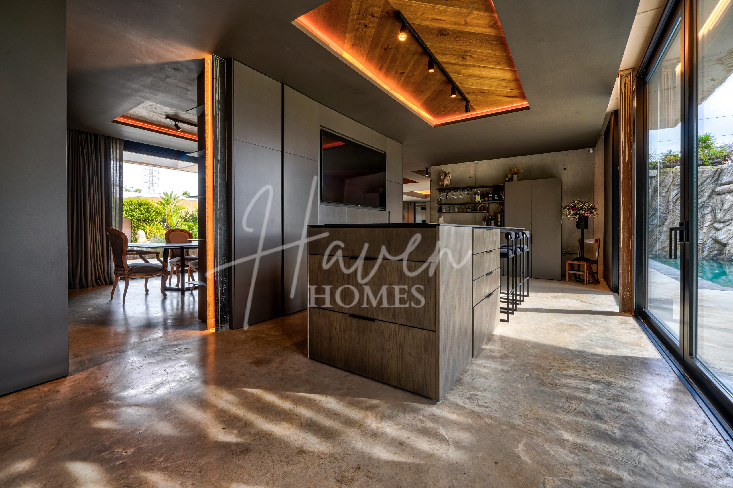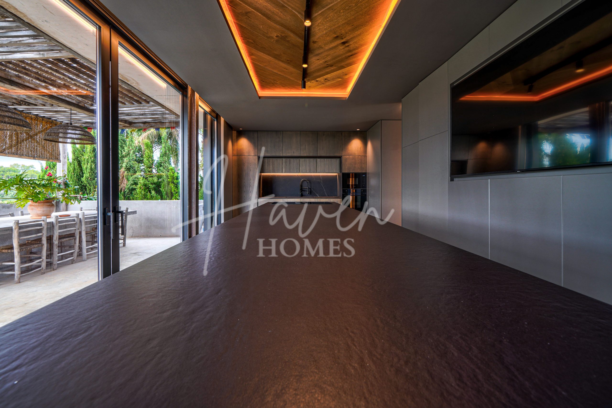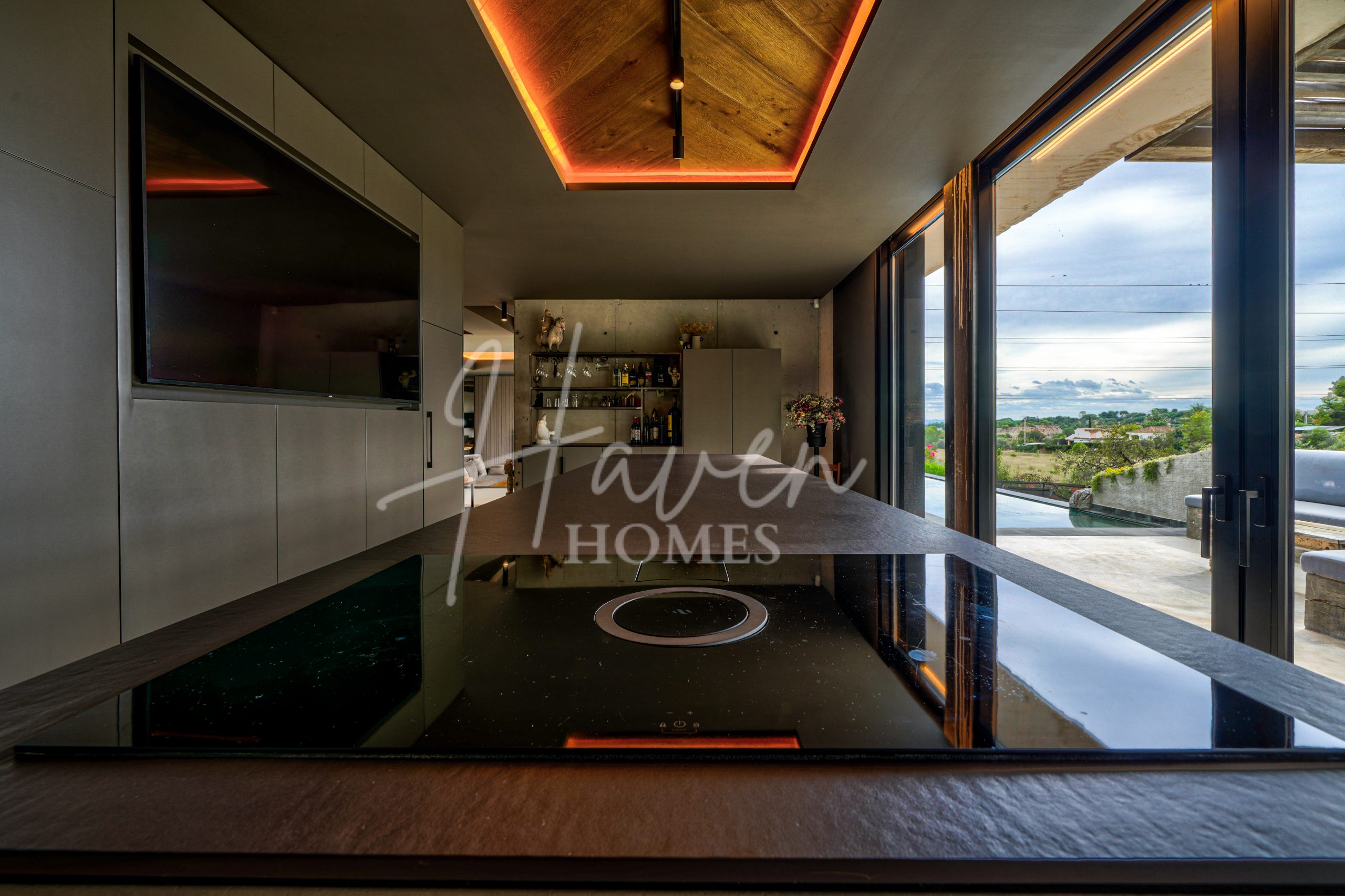 La cocina tiene vistas verdes despejadas (dada su conexión directa a la terraza trasera flotante mediante sus puertas correderas acristaladas) así como electrodomésticos integrados, isla central de 4 metros, zona de bar, diversos compartimientos para almacenaje y otra inmensa pantalla plana desde la que se puede disfrutar incluso de cine de verano desde la terraza.